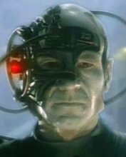 • Captain Jean-Luc Picard of the Star-Trek Next Generation (TV 1987-1994) – was turned into a cyborg by the Borg.  Luckily that change was only temporary… But the Borg themselves are a hive of cyborgs.